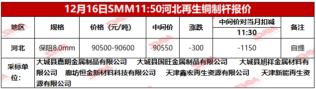 12月16日SMM河北地区再生铜制杆报价