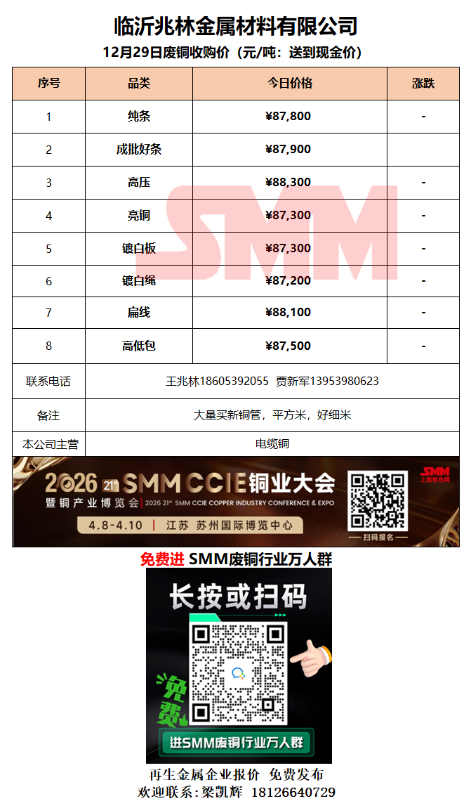 今日临沂兆林金属 废铜采购报价已更新,有货的朋友欢迎联系我们!
