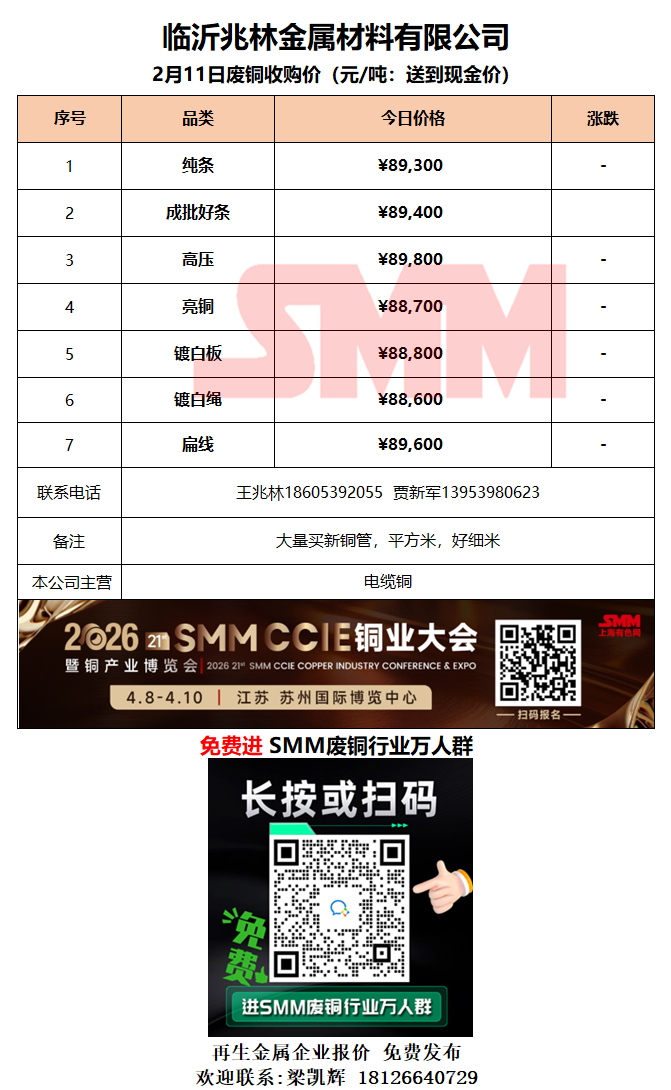 今日临沂兆林金属 废铜采购报价已更新,有货的朋友欢迎联系我们!