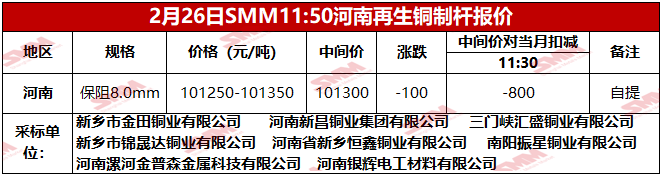 2月26日SMM河南地区再生铜制杆报价