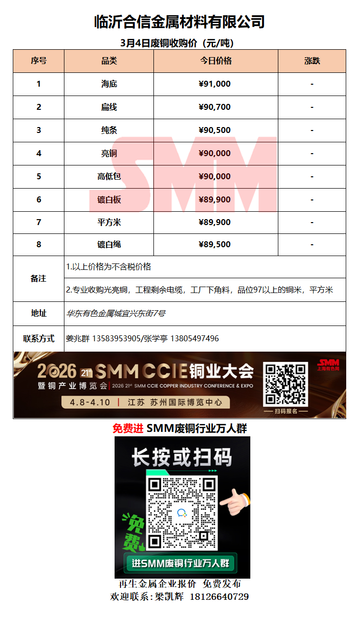 今日临沂合信金属 废铜采购报价已更新,有货的朋友欢迎联系我们!
