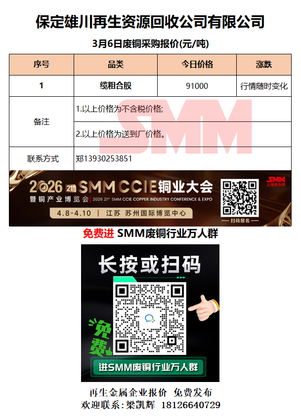 3月6日保定雄川 废铜采购报价