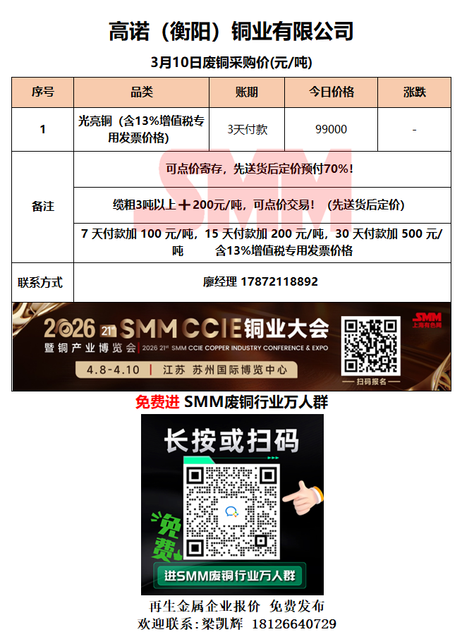 3月10日高诺(衡阳)铜业 废铜采购报价