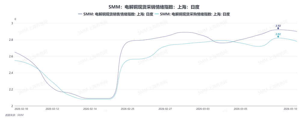 据SMM录得的上海地区电解铜现货采销情绪,采购情绪指数从2月24日的2.08升至3月10日的2.78,销售情绪指数同期从2.09升至2.90。部分下游对当前铜价接受度有限,备货策略仍以即用即采为主,销售情绪略高于采购情绪。