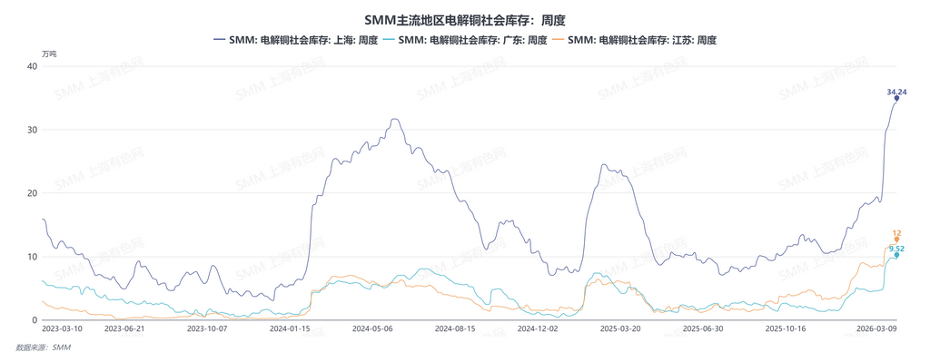 从累库节奏观察,3月2日至3月9日当周,三地库存增加1.44万吨,增幅2.65%,较2月5日至2月26日期间的周均增幅约4.5万吨明显收窄。累库速度的放缓为升贴水修复提供了改善空间。当前库存累积主要源于两方面因素:一是进口铜的陆续到货。据SMM调研,近期进口铜仍然在持续大量到货,3月份内预计到货量不会出现明显衰减。进口货源的稳定流入,为国内市场提供了持续的供应补充,是库存总量维持高位的重要支撑,4月进口到货的实际情况尚待确认,需重点关注月末海关数据及港口清关节奏的变化。二是部分货源为交割入库。