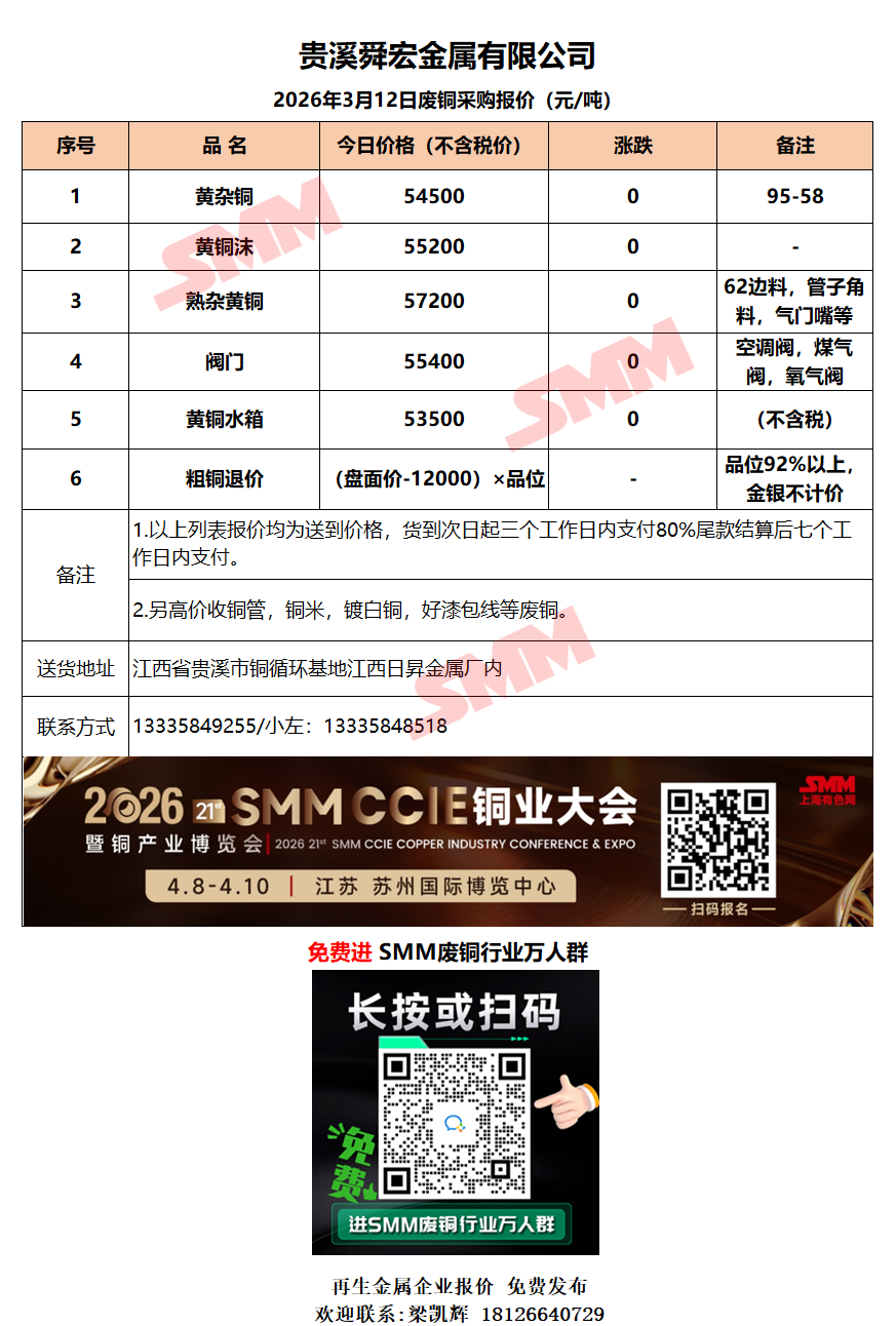 3月12日贵溪舜宏 废铜采购报价