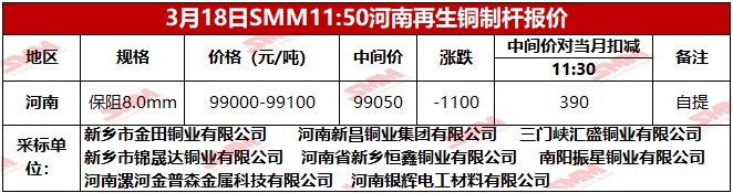 3月18日SMM河南地区再生铜制杆报价