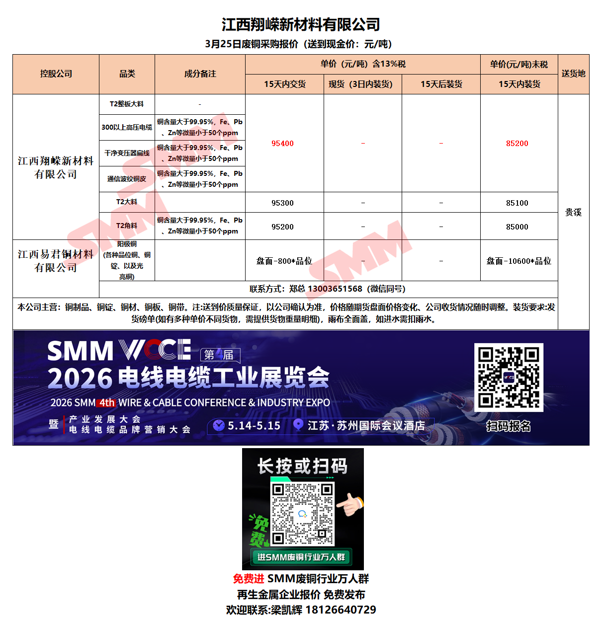 3月25日江西翔嵘新材料 废铜采购报价
