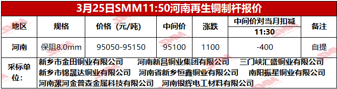 3月25日SMM河南地区再生铜制杆报价
