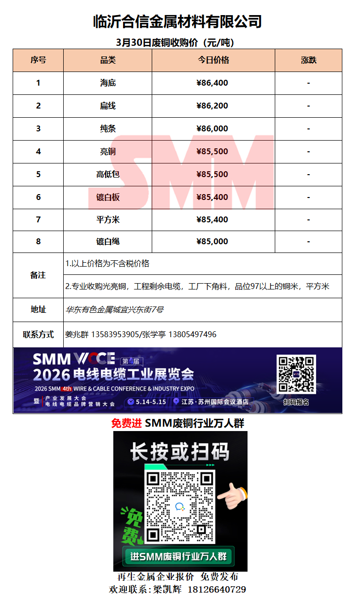 3月30日临沂合信金属 废铜采购报价