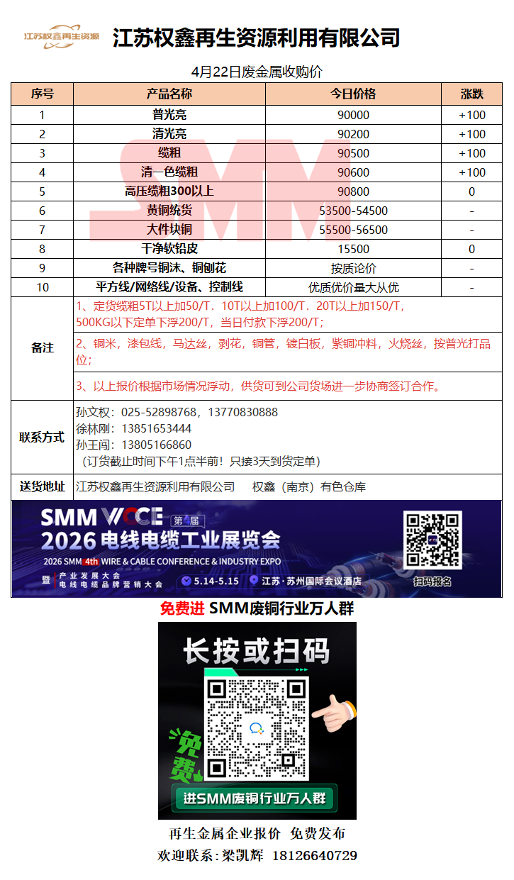 4月22日高诺(衡阳)铜业 废铜采购报价