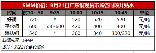 9月21日广东铜现货市场各时段升贴水(第四时段10:45)【SMM价格】