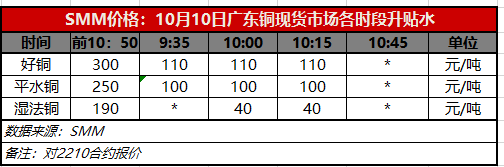 10月10日广东铜现货市场各时段升贴水(第三时段10:15)【SMM价格】