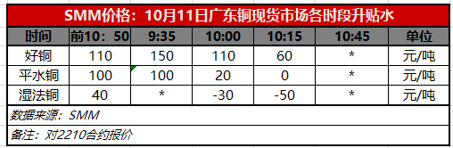 10月11日广东铜现货市场各时段升贴水(第三时段10:15)【SMM价格】