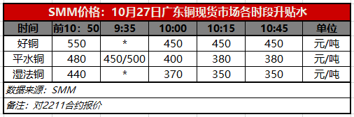 10月27日广东铜现货市场各时段升贴水(第四时段10:45)【SMM价格】