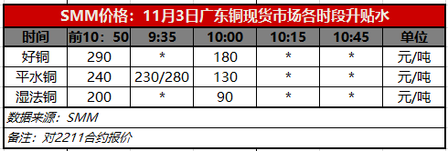 11月3日广东铜现货市场各时段升贴水(第二时段10:00)【SMM价格】