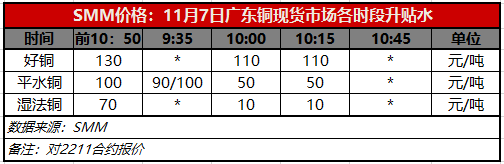 11月7日广东铜现货市场各时段升贴水(第三时段10:15)【SMM价格】