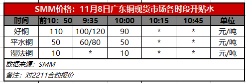 11月8日广东铜现货市场各时段升贴水(第二时段10:00)【SMM价格】
