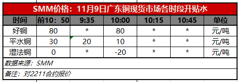 11月9日广东铜现货市场各时段升贴水(第二时段10:00)【SMM价格】