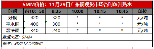 11月29日广东铜现货市场各时段升贴水(第一时段9:35)【SMM价格】