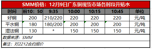12月9日广东铜现货市场各时段升贴水(第四时段10:45)【SMM价格】