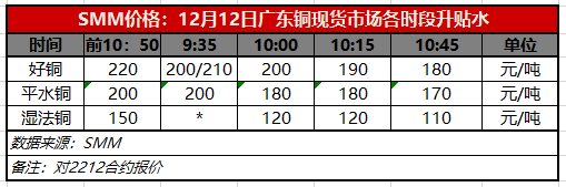 12月12日广东铜现货市场各时段升贴水(第四时段10:45)【SMM价格】