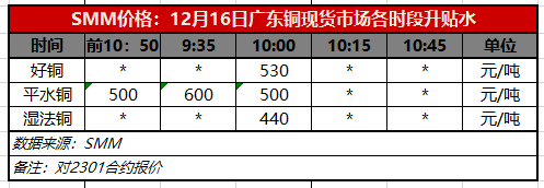 12月16日广东铜现货市场各时段升贴水(第二时段10:00)【SMM价格】
