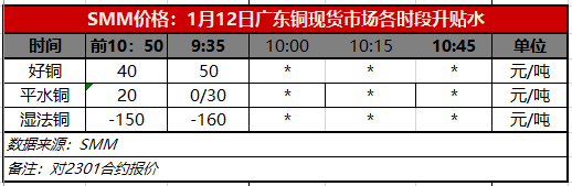 1月12日广东铜现货市场各时段升贴水(第一时段9:35)【SMM价格】