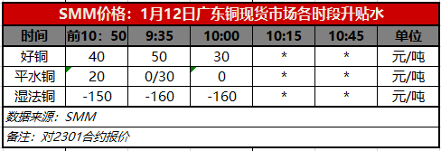 1月12日广东铜现货市场各时段升贴水(第二时段10:00)【SMM价格】