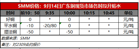 9月14日广东铜现货市场各时段升贴水(第二时段10:00)【SMM价格】