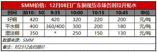 12月8日广东铜现货市场各时段升贴水(第四时段10:45)【SMM价格】