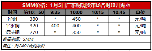 1月5日广东铜现货市场各时段升贴水(第二时段10:00)【SMM价格】