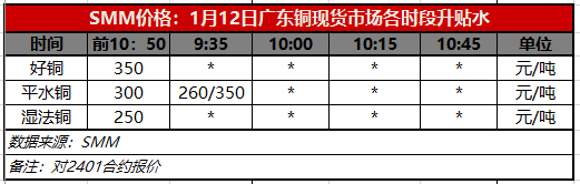 1月12日广东铜现货市场各时段升贴水(第一时段9:30)【SMM价格】