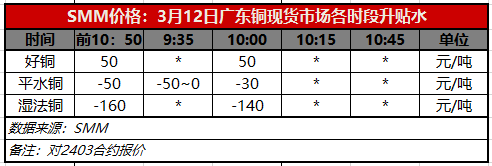 3月12日广东铜现货市场各时段升贴水(第二时段10:00)【SMM价格】