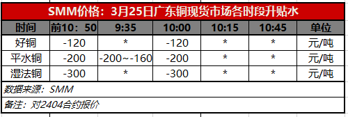 3月25日广东铜现货市场各时段升贴水(第二时段10:00)【SMM价格】