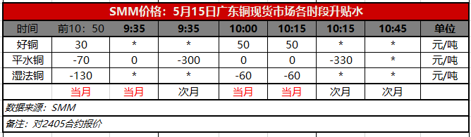 5月15日广东铜现货市场各时段升贴水(第三时段10:15)【SMM价格】