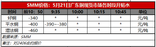 5月21日广东铜现货市场各时段升贴水(第一时段9:30)【SMM价格】