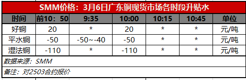3月6日广东铜现货市场各时段升贴水(第二时段10:00)【SMM价格】