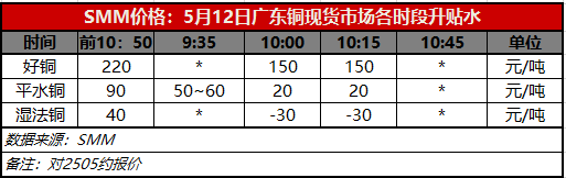 5月12日广东铜现货市场各时段升贴水(第三时段10:15)【SMM价格】