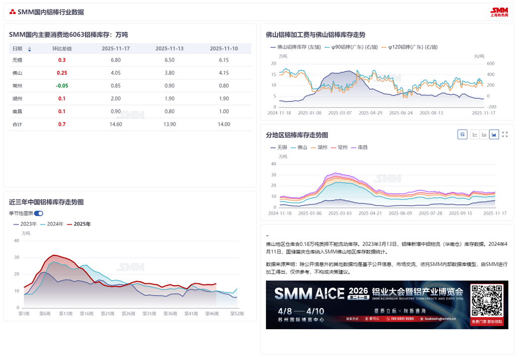 据SMM统计,11月17日国内主流消费地铝棒库存14.60万吨,较上周四库存上涨0.7万吨,较上周一库存上涨0.6万吨。