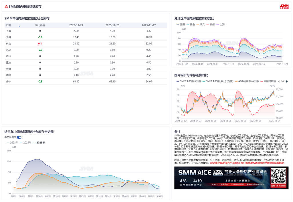 2025年11月24日电解铝锭:周一库存61.30万吨【SMM数据】