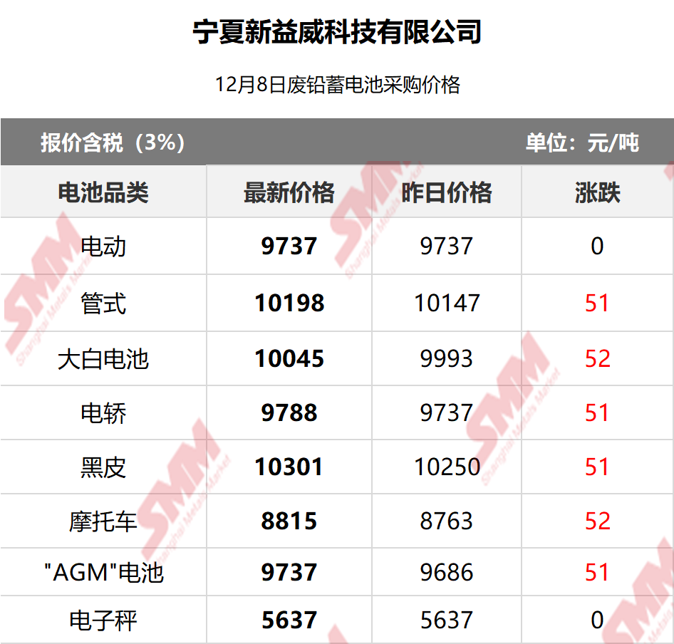 SMM 2025/12/8 国内知名再生铅企业废电瓶采购报价