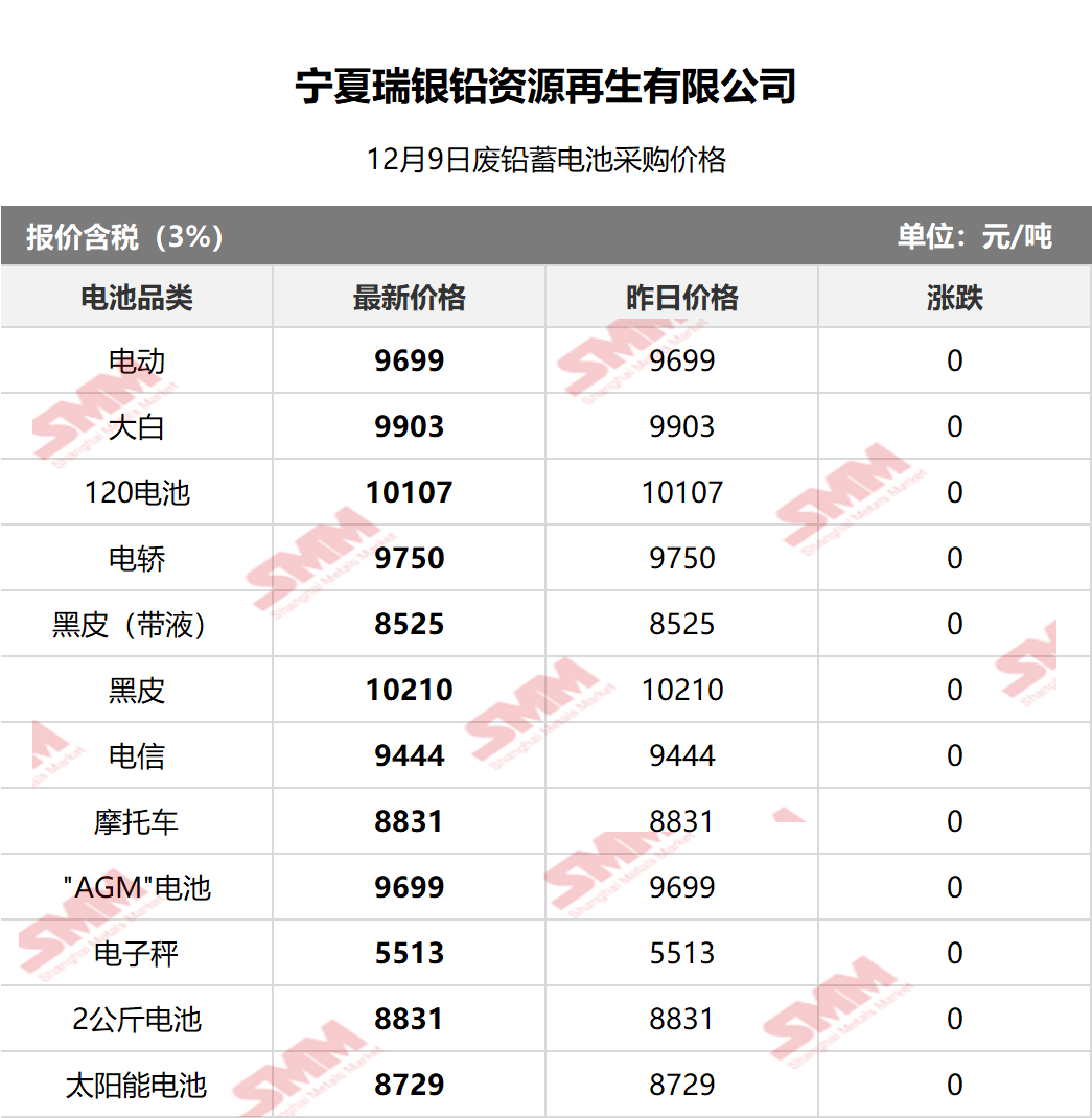 SMM 2025/12/9 国内知名再生铅企业废电瓶采购报价