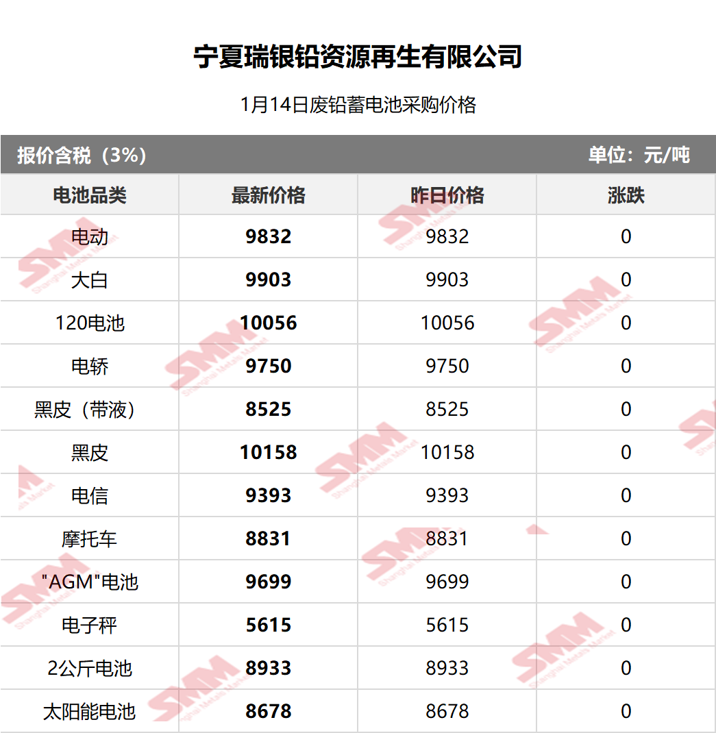 1月14日宁夏瑞银 废电瓶采购报价