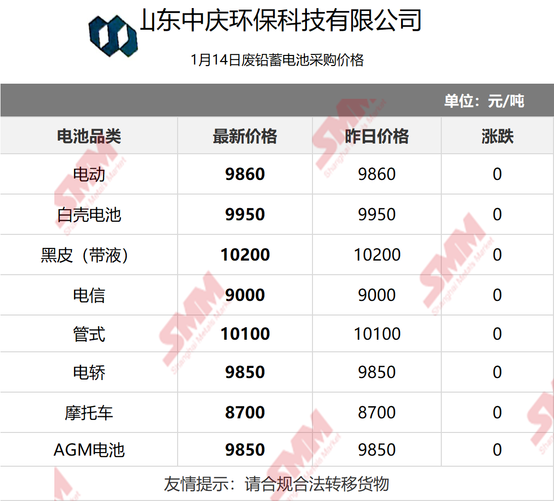 1月14日山东中庆 废电瓶采购报价