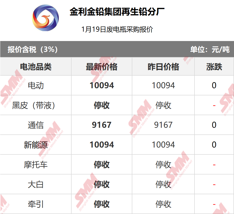 SMM 2026/1/19 国内知名再生铅企业废电瓶采购报价