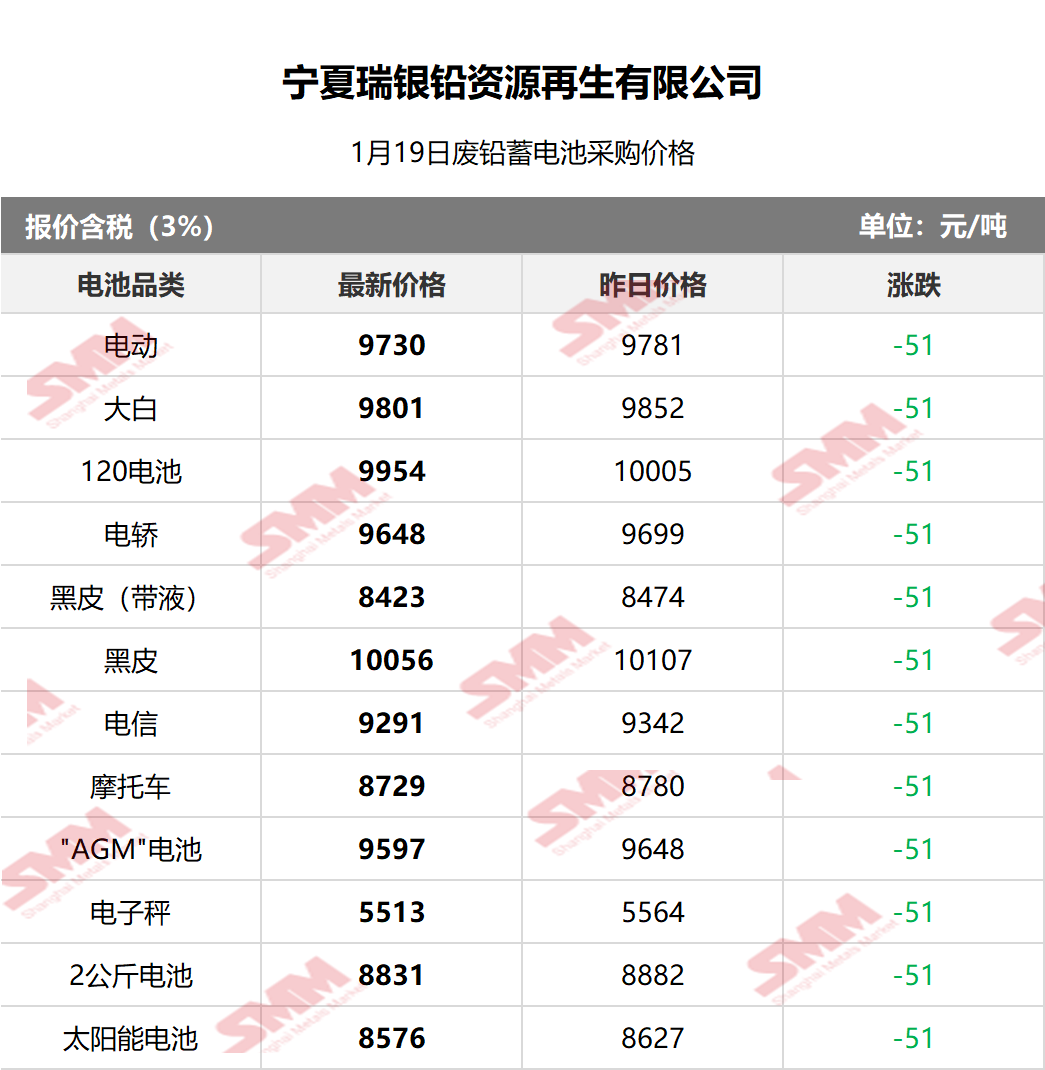 SMM 2026/1/19 国内知名再生铅企业废电瓶采购报价