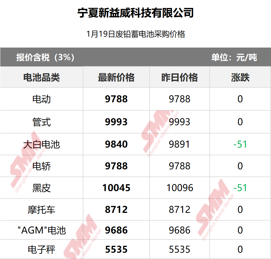 SMM 2026/1/19 国内知名再生铅企业废电瓶采购报价