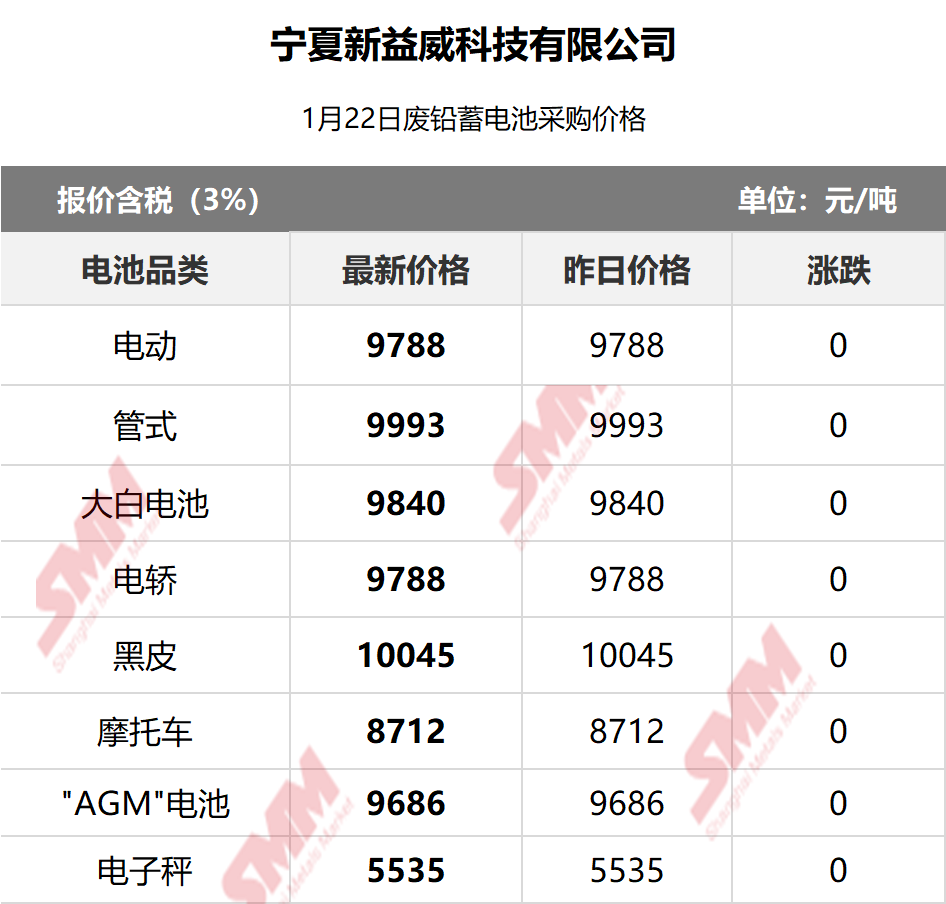 1月22日宁夏新益威 废电瓶采购报价