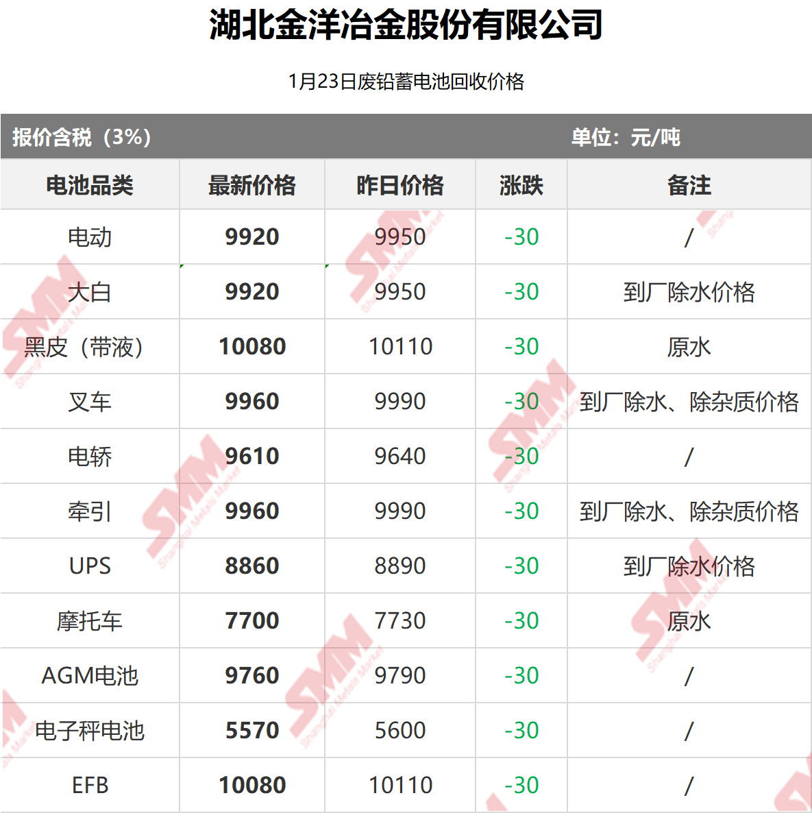 1月23日湖北金洋 废电瓶采购报价